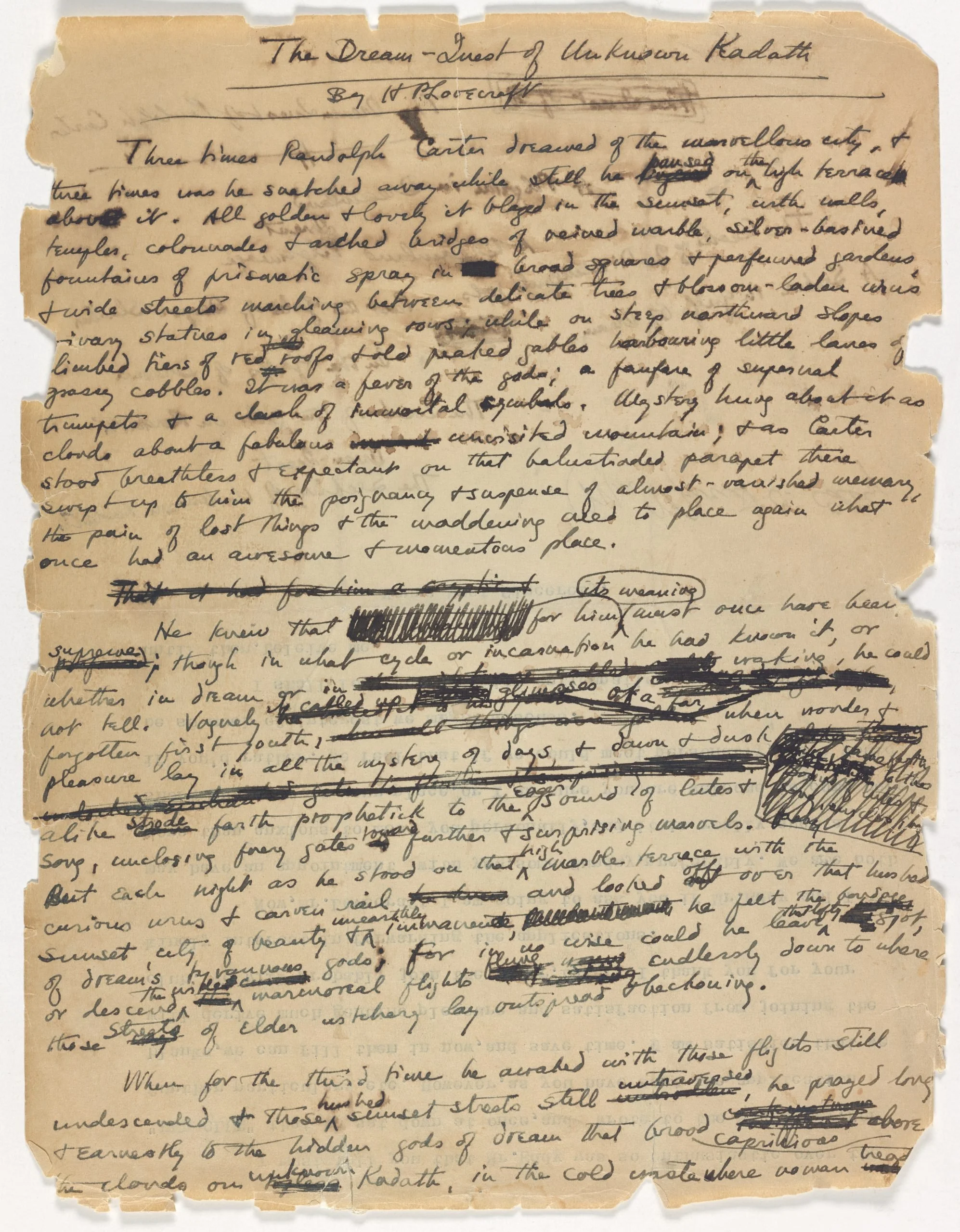 Lovecraft not only takes his readers through the hidden (often subterranean) recesses of fictionalized New England locales, but as far as the unexplored wastes of Antarctica (one of my favorites, At the Mountains of Madness), to Australia (The Shadow Out of Time), to the Congo, to various corners of Europe, to the depths of the ocean, to vast cities that rose on Earth before the evolution of human beings, to the edges of the cosmos and beyond, and to the furthest reaches of Earth's Dreamland. But it was something very concrete, tangible and grounded that captured my attention just as much when I stumbled across it: the first page of the first draft of his aforementioned phantasmagorical epic The Dream-Quest of Unknown Kadath.
