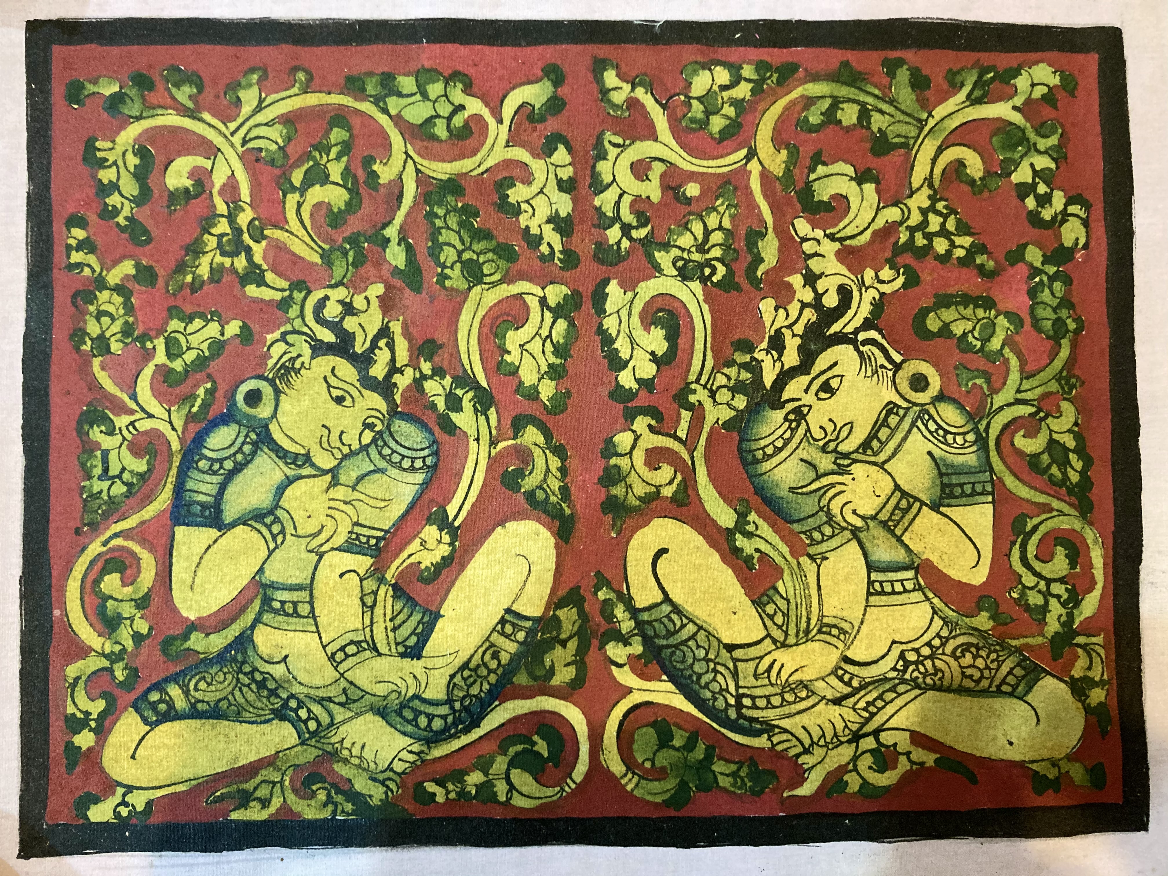 Laid upon the ancient stone floor of the room was an array of painted tapestries. An elderly woman was seated there alongside them. The paintings were colorful, intricate, some featuring Buddhist elements, and others whose inspirations were unfamiliar to me. The tapestries were of various sizes. There were prices next to them, written on scraps of paper, ranging from perhaps $5-$10 USD. As I admired the art, I asked the woman if she was the painter, and though she’d been quiet since I’d entered the temple, she confirmed that she was.