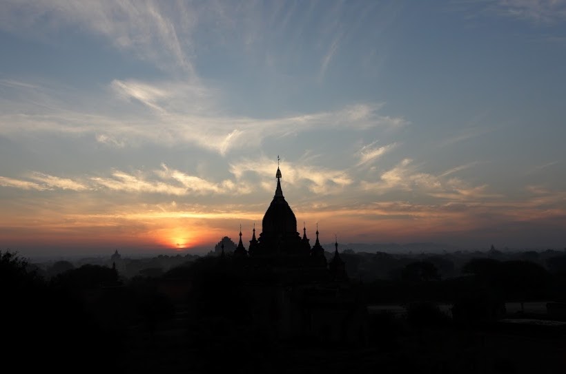 We scurried into the dark of the bottom floor of the structure, then up a stone staircase, emerging into the open-air gloom of the second floor, where the world held its breath in that moment. Within only a minute, the red sun appeared above the distant mountains, and the majesty of Bagan became apparent in the form of its countless temples and pagodas dotted far and wide across the land, silhouetted in those first rays.